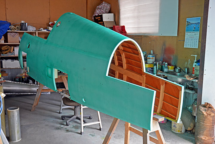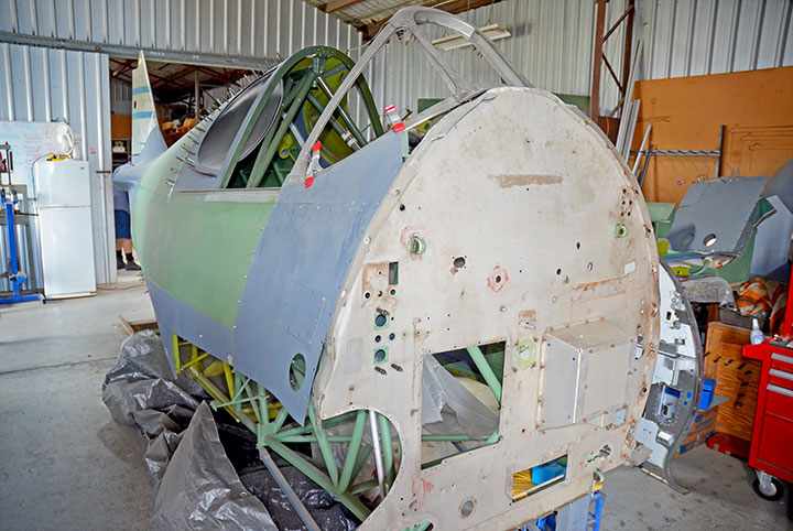 A46-249 is a CA-19, (last Boomerang built by CAC), being worked on for The Old Aeroplane Company of Tyabb Victoria. With the timber fuselage shell now cloth covered, it is about to be painted in primer before being fitted with the assorted metal work required for attaching various panels, canopy rails, and doors. Both the rear tubular frame and cockpit section are repaired. The whole assembly is now to be blasted/ primed and painted so that additional internal fuselage work can continue at the Brisbane workshop and later at Tyabb.