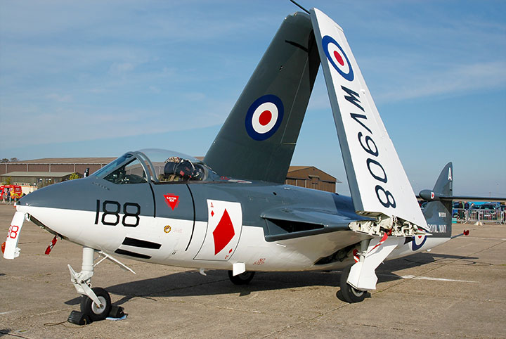 WV908 was constructed as an Mk4 by Hawkers at Bagington, Coventry in 1954, and then transported to Bitteswell where she was assembled and flown. The Sea Hawk was issued to RN 807 Squadron aboard HMS Ark Royal and then HMS Bulwark and then RNAS Brawdyin 1957 the aircraft was converted to FGA 6 specification and issued to 806 Squadron. In 1960 the Sea Hawk moved north to Scotland with 738 Sqn at RNAS Lossiemouth. In 1962 WV908 was retired and placed in storage in Belfast from where she travelled to RAF Halton for use as a systems trainer where she remained until 1976 when she was transferred to RNAS Culdrose for restoration to flying condition and she flew again on 23 May 1978 WV 908 was then moved after a couple of years to Yeovilton to join the Fleet Air Arms historic where she remained and has flown on and off ever since although as stated the old girl has spent much of her time inactive with serviceability issues mainly related to engine and jet pipe failures.