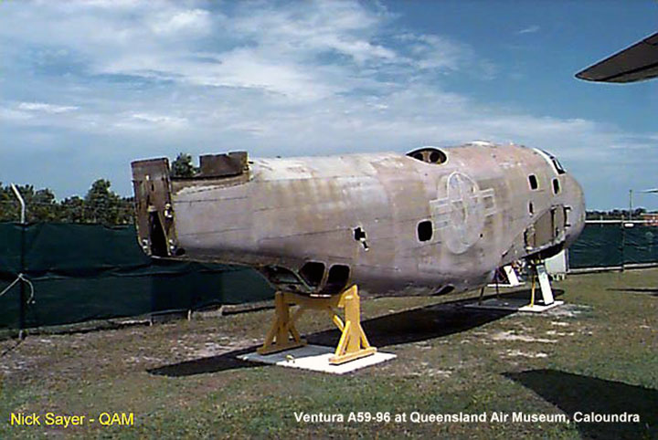 This particular aircraft A59-96, had a limited career with the RAAF having been delivered to the RAAF at Bankstown after a ferry flight from Hawaii on June 1 1944. The aircraft spent most of its wartime service in storage at Evans Head NSW where it was subsequently damaged by a Cyclone. Following continued storage the Ventura was disposed of by the Commonwealth in 1949 and passed through a number of civil owners mainly being used as a storage vessel and losing its wings in the process. By 1984 the aircraft had been acquired by Chewing Gum Field Museum, Tallebudgera who eventually sold the aircraft to QAM in 1991.