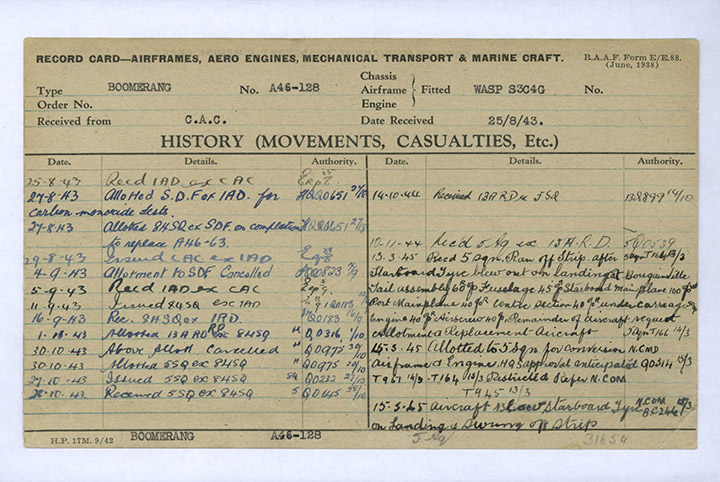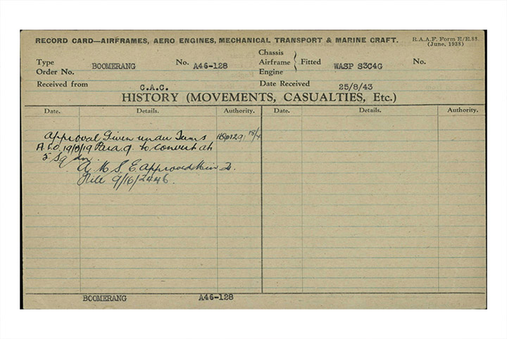 This Boomerang was delivered by CAC to the RAAF in August 1943 with construction number 951 and went to No1 Air Depot on 25th of August 1943. Two days later on the 27th of August it was to be sent to the SDU (Special Duties Flight) where it was to be used to test the Boomerangs Carbon Monoxide levels. This however was cancelled and the aircraft was re allocated to 84 Squadron on the 11th of September 1943 and delivered to that Squadron on the 16th of September. At this time 84 Sqn was a part of No 72 wing operating out of the Torres Straight at Horn Island.